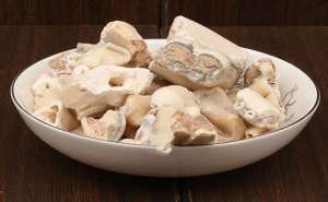 【药材性状】不规则块状或粒状,无色或淡黄白色,透明或半透明。表面略平滑或凹凸不平,具细密纵棱,有玻璃样光泽,常披有白色细粉。质硬而脆,易砸碎,断面显玻璃样光泽。断口不平坦。气微,味酸,微甘而极涩。
